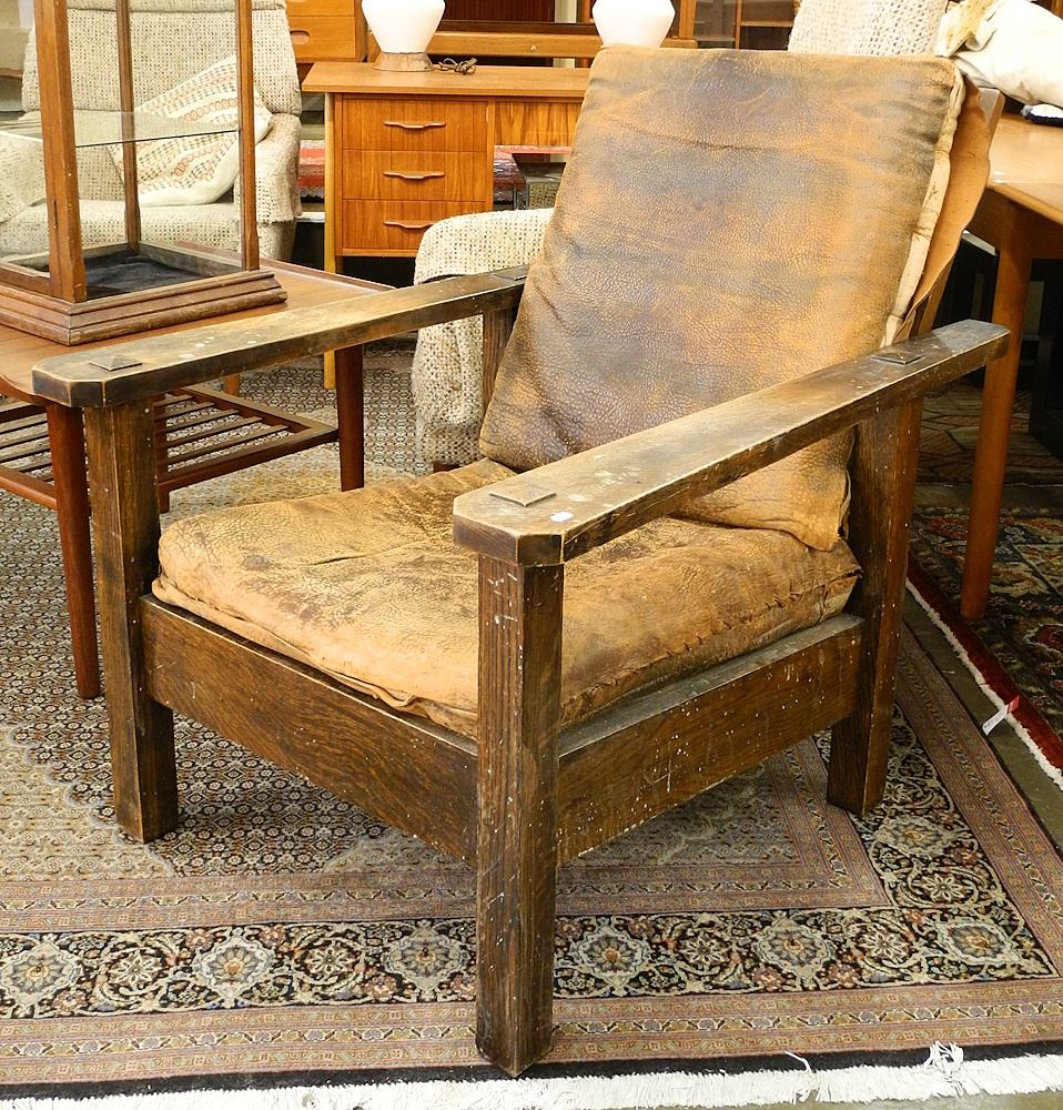 LOT 311 Oak Arts & Crafts Morris Chair with Old Leather Cushions, as found. Estimate: $60 - $100 Sold For: $120 Auction Date: Tuesday, September 26 2023 at 4:00 PM