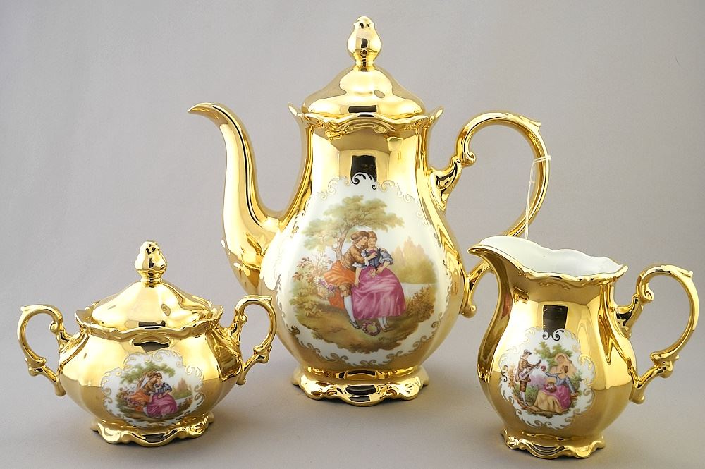 HK Bavaria Germany 22K Gold Coffee Set with 12 Trios, marked "Handwork" with various Courting Scen