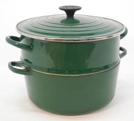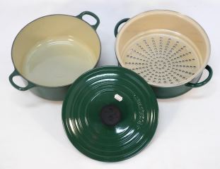 LOT 73 NEW Le Creuset Round Steamer Casserole, #24, Green. Estimate: $100 - $150 Sold For: $300 Auction Date: Tuesday, September 26 2023 at 4:00 PM