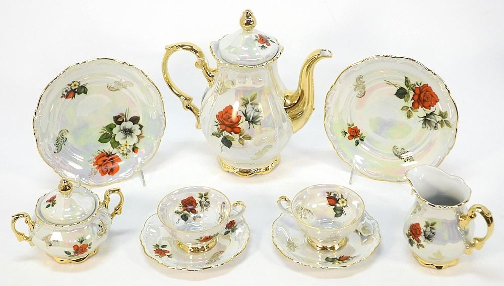 Bavaria Germany Coffee Set with 2 Trios, White Field with Red Roses, Gold Trimmed.