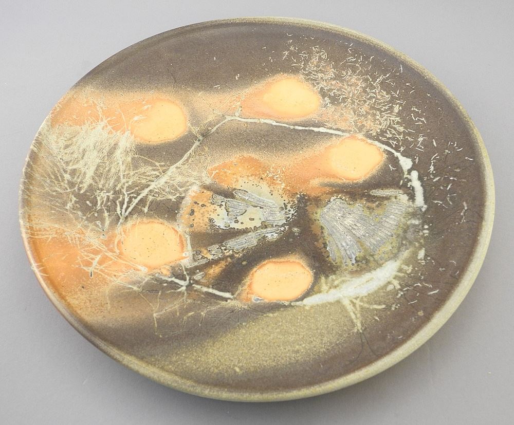Stoneware Dish signed (Pat) Webber, 11 1/8" diameter.