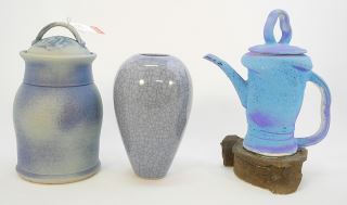 LOT 83 3 Blue Glazed Pottery Vessels, 1 signed Tennant, 9 1/2" - 13 3/4"H. Estimate: $50 - $60 Auction Date: Tuesday, September 26 2023 at 4:00 PM