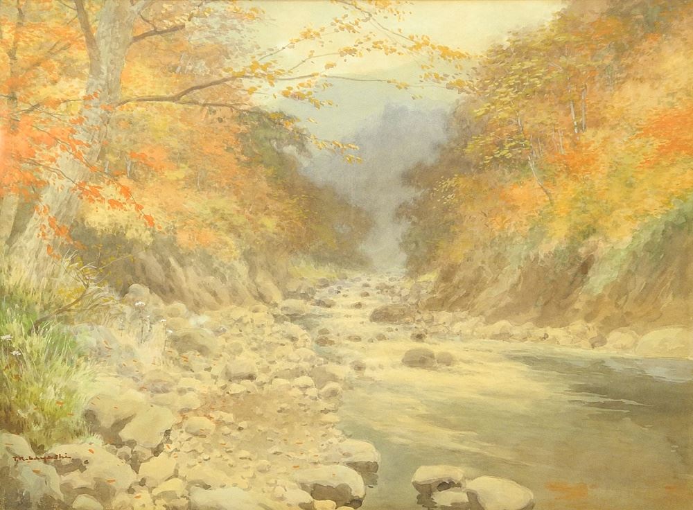 Watercolour signed T. Kobayashi, 19 1/4" x 26", "River in Autumn".
