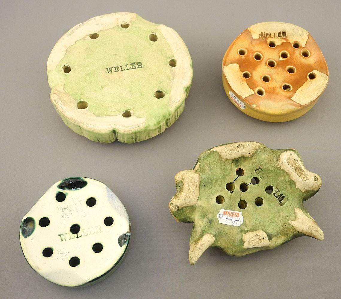 LOT 153 4 Weller Pottery Flower Frogs: Crab / Floral / Green / Caramel 3 1/2 - 5 1/4". Estimate: $80 - $100 Sold For: $70 Auction Date: Tuesday, February 06 2024 at 4:00 PM