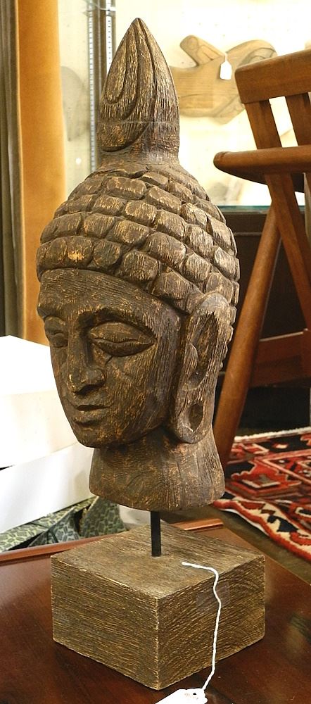 LOT 90 Carved Wood Head of the Buddha on Stand, 20"H. Estimate: $60 - $100 Sold For: $60 Auction Date: Tuesday, February 06 2024 at 4:00 PM