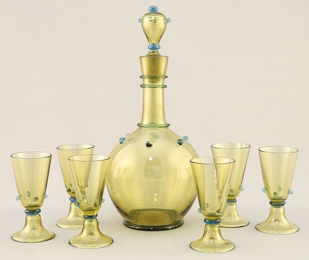 LOT 270 Italian Art Glass Carafe & Glasses Set, 7 5/8"H. Estimate: $60 - $100 Sold For: $50 Auction Date: Tuesday, February 06 2024 at 4:00 PM