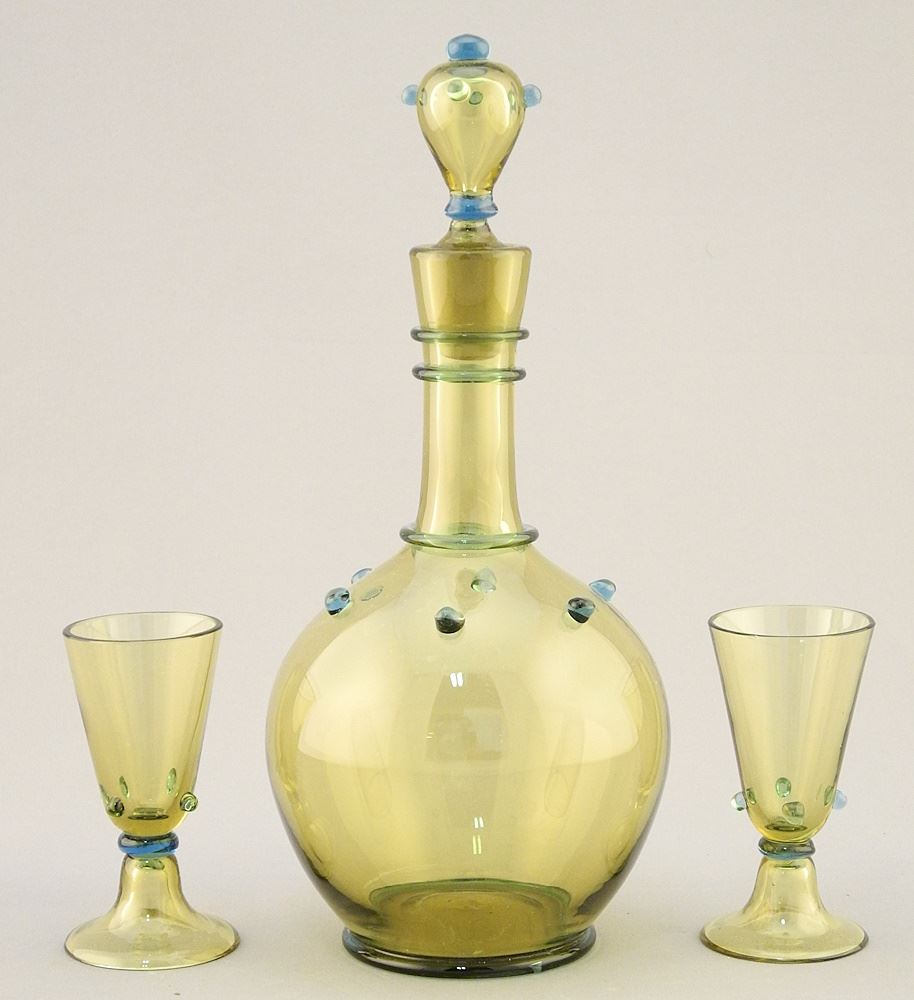LOT 270 Italian Art Glass Carafe & Glasses Set, 7 5/8"H. Estimate: $60 - $100 Sold For: $50 Auction Date: Tuesday, February 06 2024 at 4:00 PM