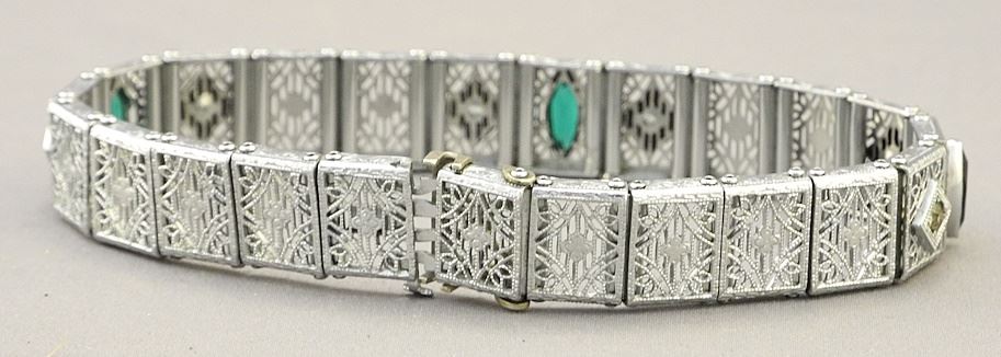 LOT 288 Silver Tone Metal Bracelet with Green Stones, TW 13.14 grams. Estimate: $50 - $80 Sold For: $40 Auction Date: Tuesday, February 06 2024 at 4:00 PM