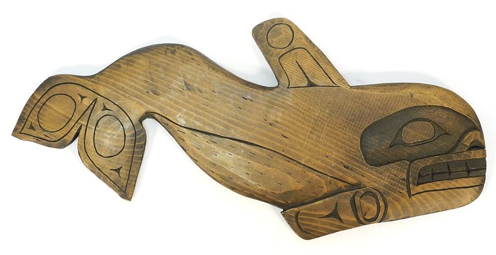 LOT 281 Cedar Plaque signed John Elliott Saanich, BC, 22"W, "Lenes - Whale Design". Estimate: $60 - $100 Sold For: $50 Auction Date: Tuesday, February 06 2024 at 4:00 PM