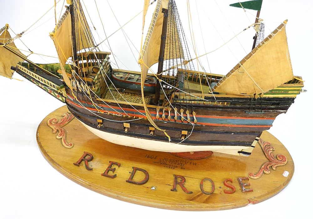 LOT 22 Ships Model, "Red Rose", 29 1/2" x 35 x 17 1/2". Estimate: $80 - $120 Sold For: $60 Auction Date: Tuesday, February 06 2024 at 4:00 PM