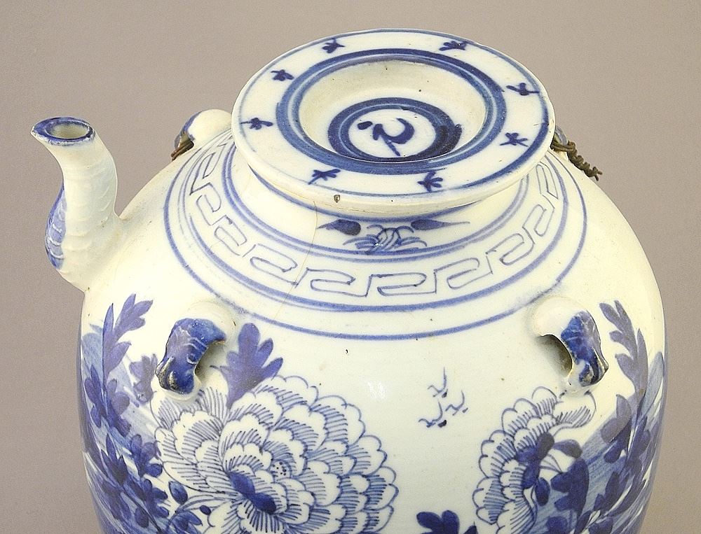 Blue & White Chinese Wine Pot with Lid, 8 1/2" x 8".