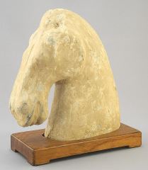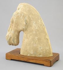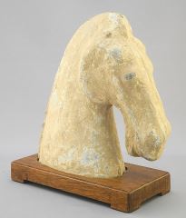 LOT 202 Western Han Molded Terracotta Horse Head (7 1/4" x 2 1/2" x 6 3/8") with Teak Stand. Estimate: $300 - $500 Auction Date: Tuesday, June 04 2024 at 4:00 PM