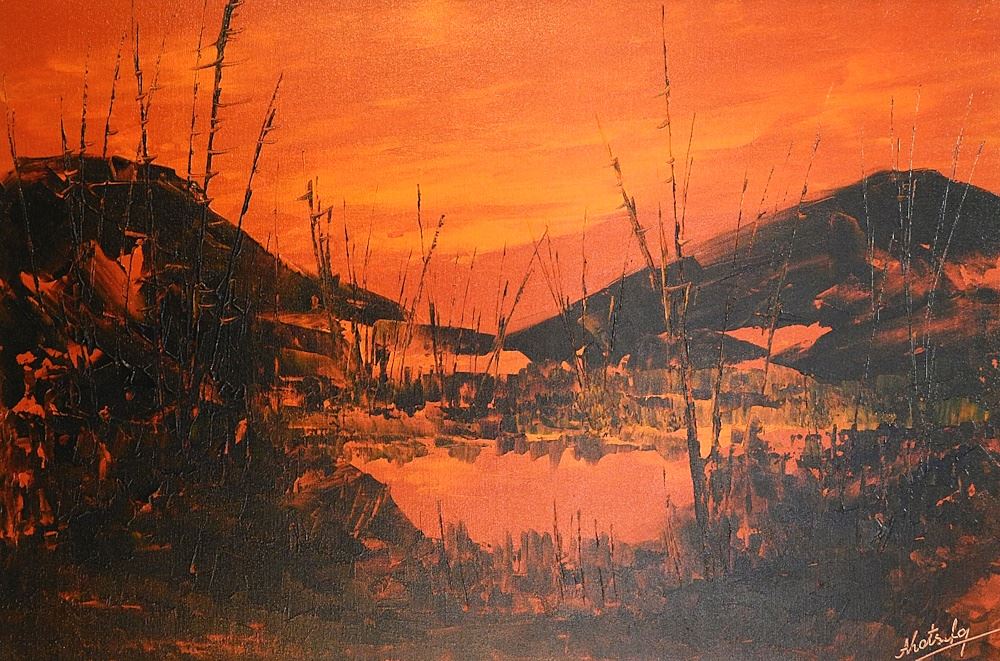 LOT 75 Oil on Canvas signed Indistinctly, 23 1/2" x 35 1/2", "Untitled Nuclear Sunset". Estimate: $80 - $120 Sold For: $20 Auction Date: Tuesday, June 04 2024 at 4:00 PM