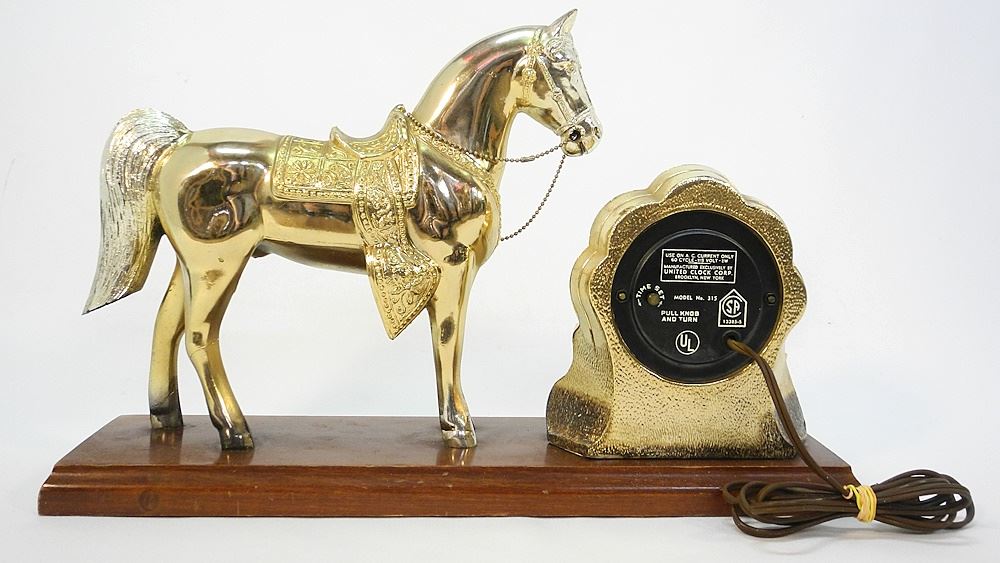 LOT 151 "United" Gold Tinted Chrome Horse Clock, 10 7/8" x 17" x 4 7/8". Estimate: $60 - $100 Sold For: $80 Auction Date: Tuesday, June 04 2024 at 4:00 PM