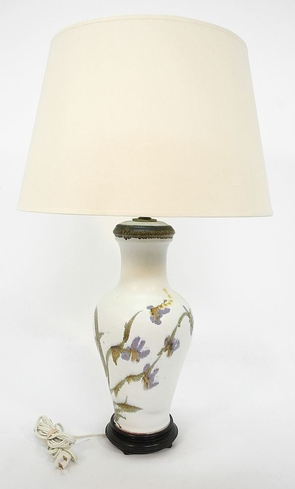 LOT 41 Porcelain Lamp with Impressed Mark of Larry Aguilar, TH 25 1/4". Estimate: $60 - $100 Sold For: $30 Auction Date: Tuesday, June 04 2024 at 4:00 PM