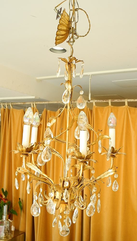 LOT 12 Vintage Gilt Metal & Crystal Droplet Ceiling Fixture, Approx. 24"h. Estimate: $100 - $150 Sold For: $70 Auction Date: Tuesday, June 04 2024 at 4:00 PM