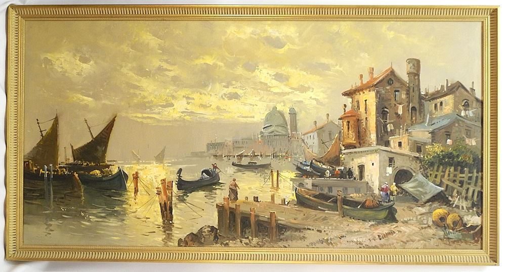 Oil on Canvas signed Indistinctly, 23 3/8" x 47 3/8", "Venetian Scene".