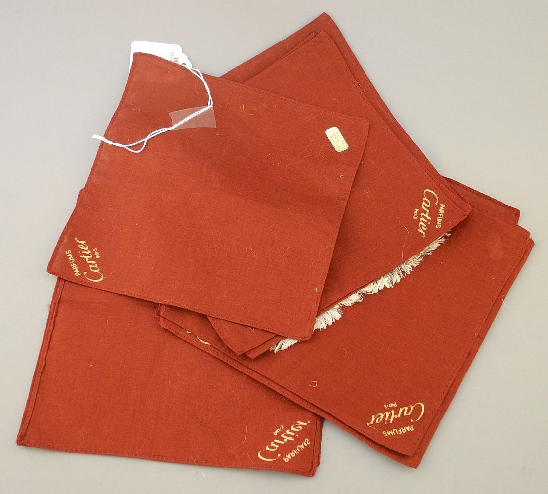 LOT 206 10 Vintage Cartier Perfume Cloth Squares, Made in Japan, 6 3/4" x 6 3/4". Estimate: $50 - $60 Sold For: $10 Auction Date: Tuesday, June 04 2024 at 4:00 PM