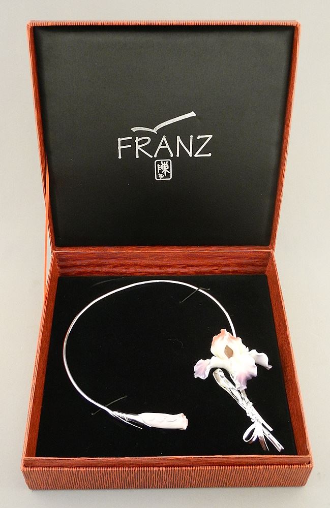 LOT 61 Franz Porcelain "Orchid" Necklace on Plated Neck Piece. Estimate: $80 - $100 Auction Date: Tuesday, June 04 2024 at 4:00 PM