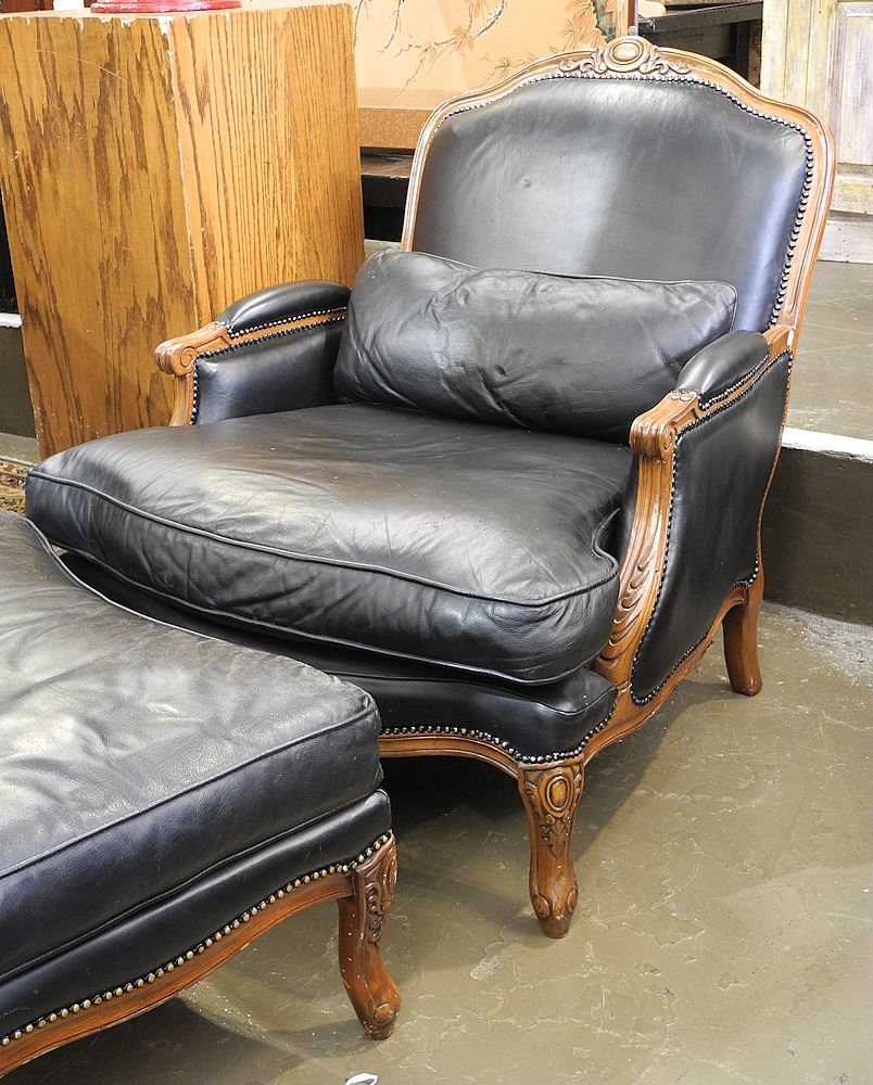 LOT 52 Black Leather Bergere Chair & Ottoman. Estimate: $100 - $200 Sold For: $450 Auction Date: Tuesday, September 24 2024 at 4:00 PM