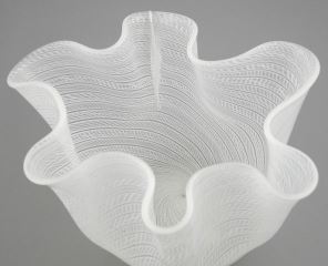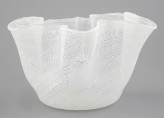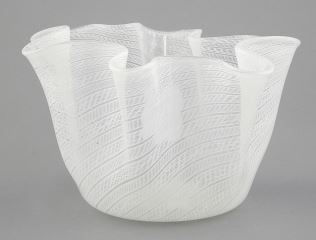 LOT 59 Italian Murano White Latticino Handkerchief Vase, 4 1/4 x 8 x 6 1/4" Estimate: $50 - $100 Sold For: $100 Auction Date: Tuesday, September 24 2024 at 4:00 PM