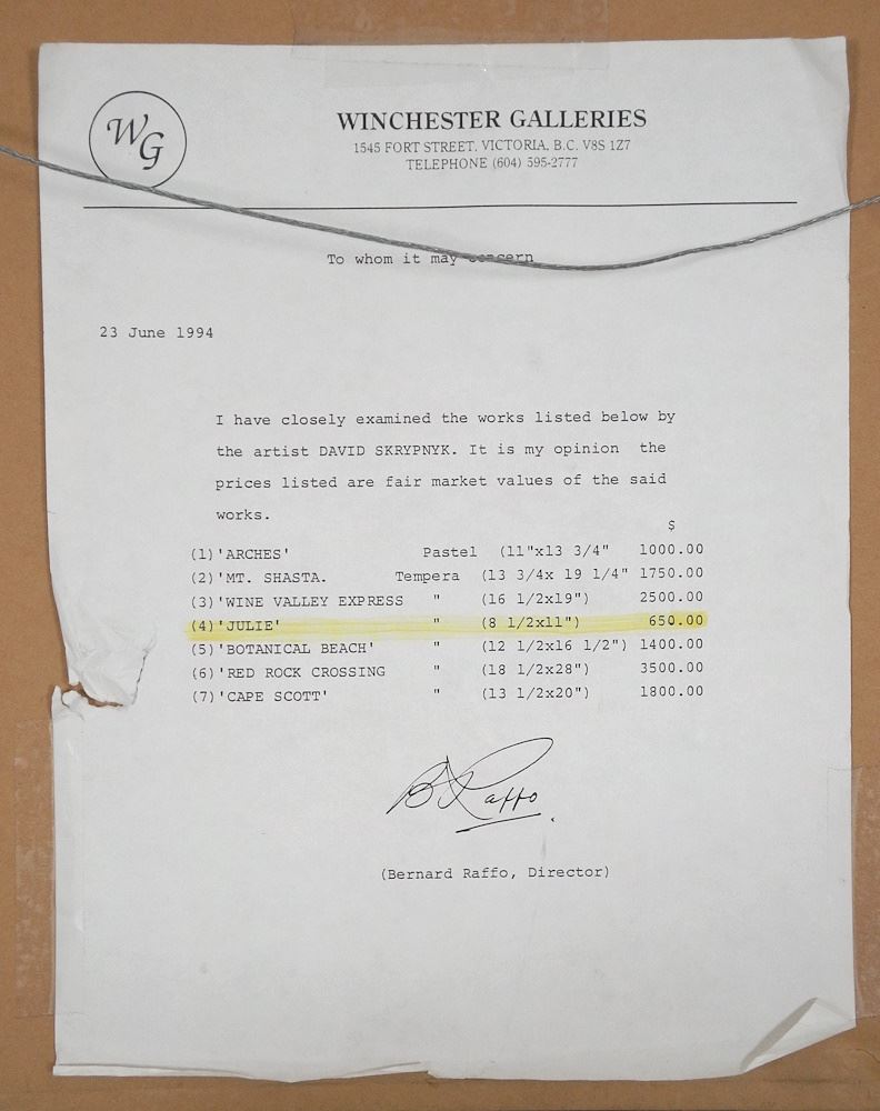 LOT 188 Watercolour & Gouache signed D. (David) Skrypnyk'94, 11" x 8 5/8", "Julie". Estimate: $60 - $100 Sold For: $5 Auction Date: Tuesday, September 24 2024 at 4:00 PM