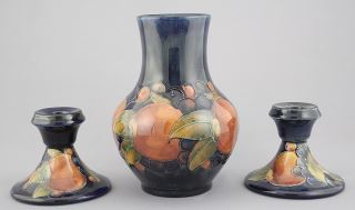 Moorcroft Pomegranate Vase (6 7/8") & Pair of Candlesticks.