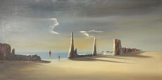 LOT 37 Oil on Canvas signed J. (John) Stancin, 20 1/2" x 40", "Surrealist Harbour Scene". Estimate: $150 - $300 Sold For: $150 Auction Date: Tuesday, September 24 2024 at 4:00 PM