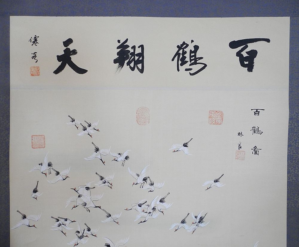 Chinese Ink & Colour Scroll Painting , Sight 49 1/2" x 22 3/4", "Cranes & Pine".