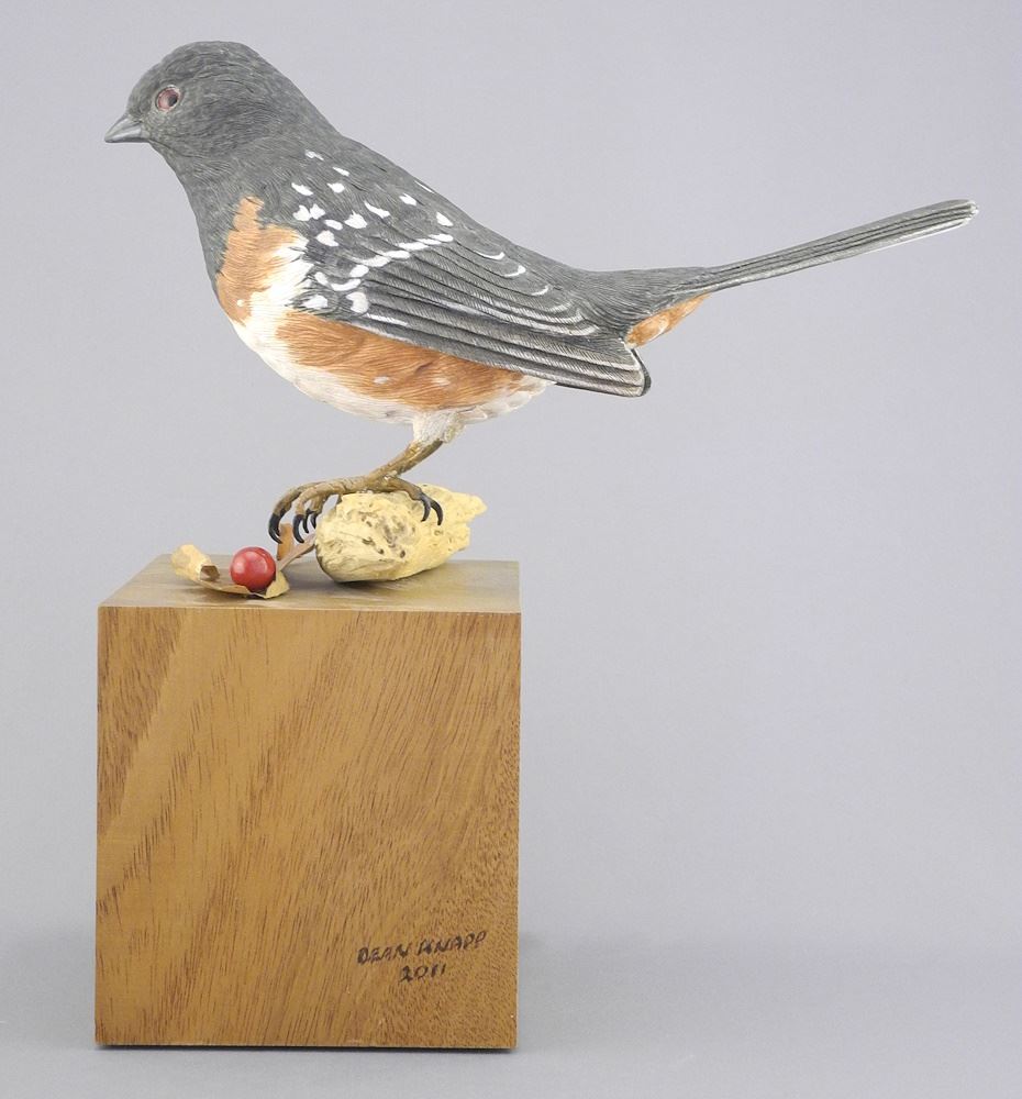 LOT 6 Wood Sculpture signed Dean Knapp 2011, 9 5/8"h, "Rufous Sided Towhee" (chip noted). Estimate: $50 - $100 Sold For: $25 Auction Date: Tuesday, January 21 2025 at 4:00 PM