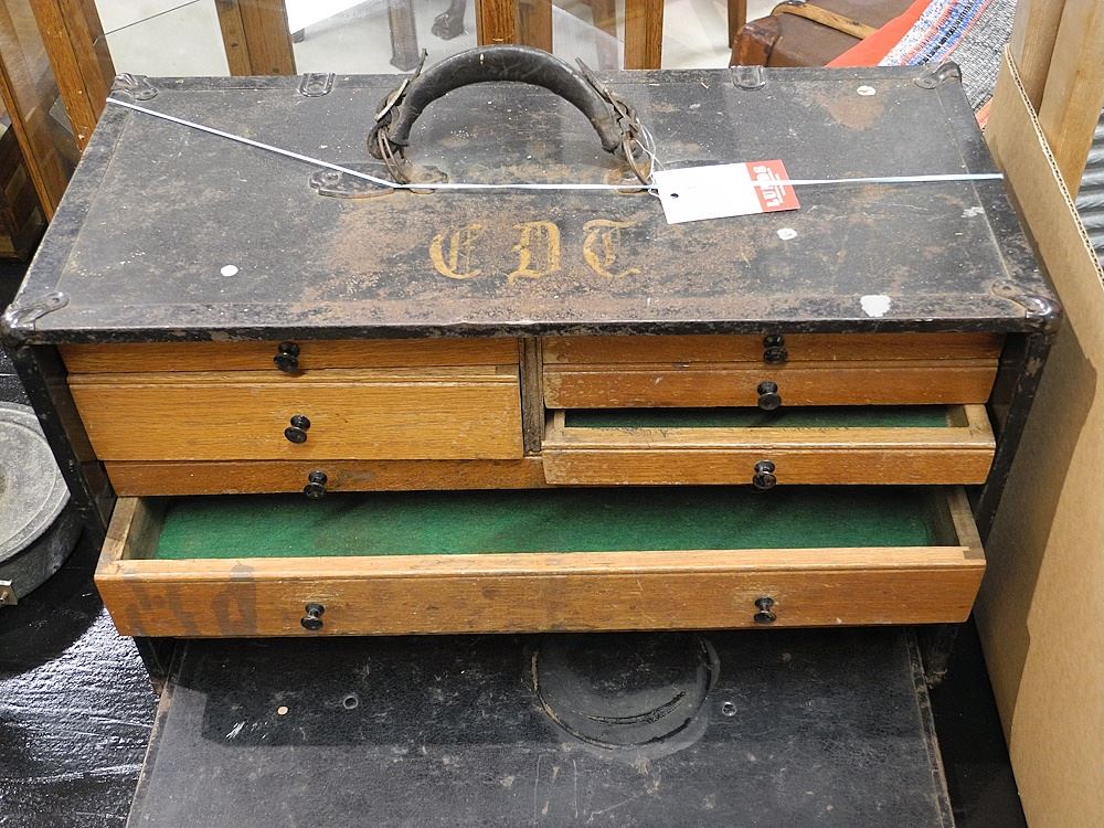 LOT 54 Antique Machinists Tool Chest, As Found - no key, 12 1/2" x 20 1/8" x 9 1/2". Estimate: $100 - $150 Sold For: $110 Auction Date: Tuesday, January 21 2025 at 4:00 PM