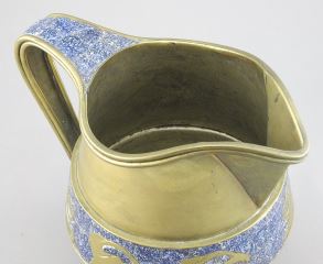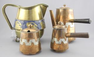 LOT 82 Mexican Silver Banded Copper Coffee Service (7 1/4") Marked Faintly & Brass Pitcher (hinge noted Estimate: $80 - $120 Sold For: $80 Auction Date: Tuesday, January 21 2025 at 4:00 PM