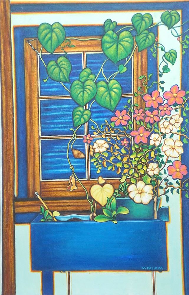 LOT 221 Acrylic on Canvas signed Miriam (Nelken), 36 1/2 x 24", "Blue Window Mystery", 1995. Estimate: $50 - $150 Sold For: $35 Auction Date: Tuesday, July 15 2025 at 4:00 PM