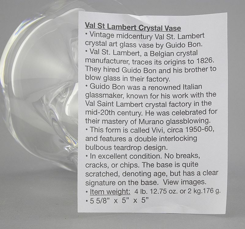 Val St. Lambert Crystal Vase, Design Guido Bon, 5 5/8".