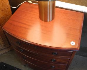 LOT 51 Petite Bow-Front Mahogany Four Drawer Chest, 29 3/8"h. Estimate: $80 - $120 Sold For: $250 Auction Date: Tuesday, July 15 2025 at 4:00 PM