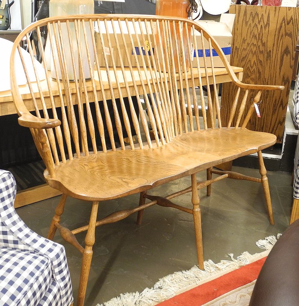 LOT 202 Oak Windsor Settee signed Muehlman 306, 49 1/2"w. Estimate: $100 - $200 Sold For: $160 Auction Date: Tuesday, July 15 2025 at 4:00 PM