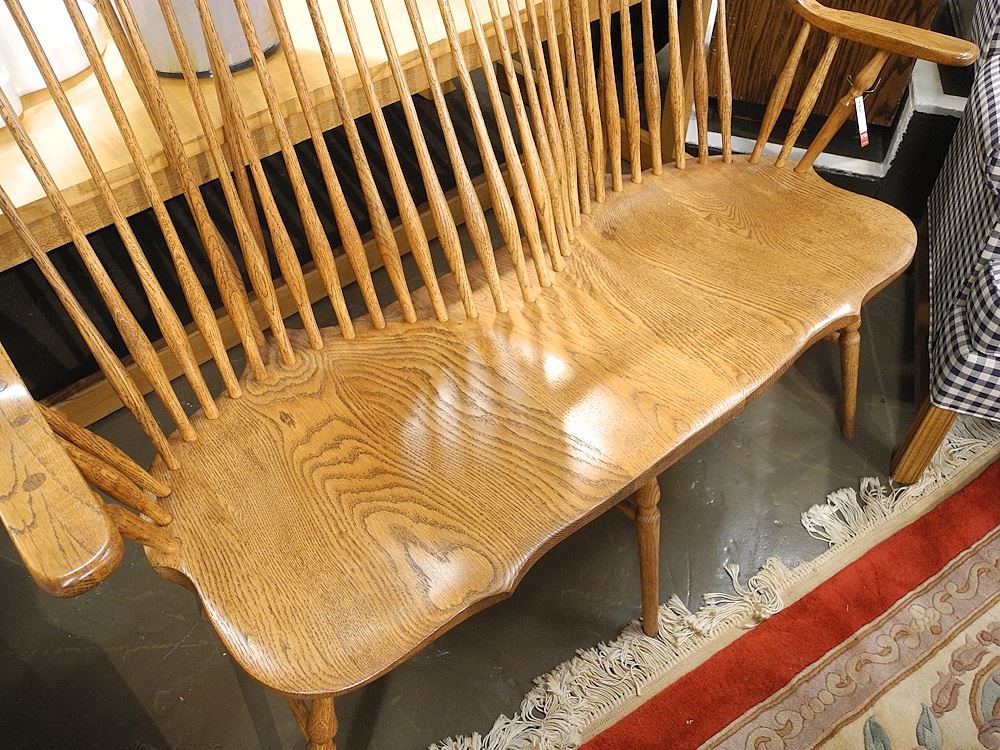 LOT 202 Oak Windsor Settee signed Muehlman 306, 49 1/2"w. Estimate: $100 - $200 Sold For: $160 Auction Date: Tuesday, July 15 2025 at 4:00 PM