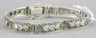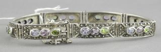 Silver (tested .800) Peridot/ Amethyst/Blue Topaz & Marcasite Bracelet, 7"L, 24g.
