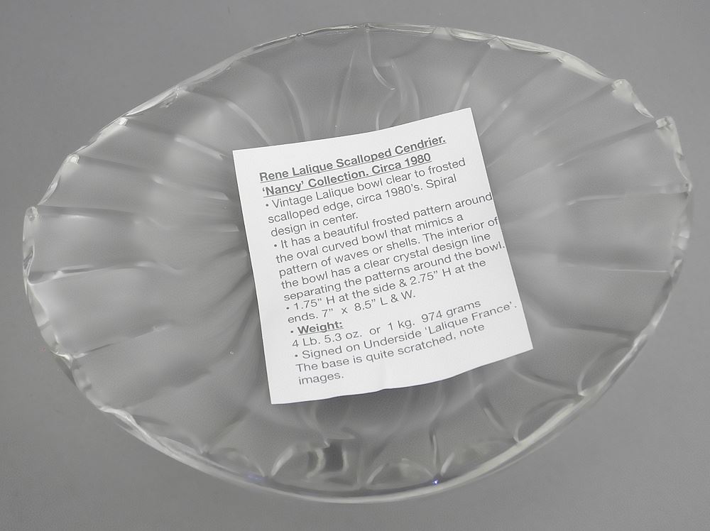 LOT 329 Lalique France Scalloped Cendrier, "Nancy" Collection C.1980, 8 1/2"w. Estimate: $100 - $200 Sold For: $50 Auction Date: Tuesday, July 15 2025 at 4:00 PM
