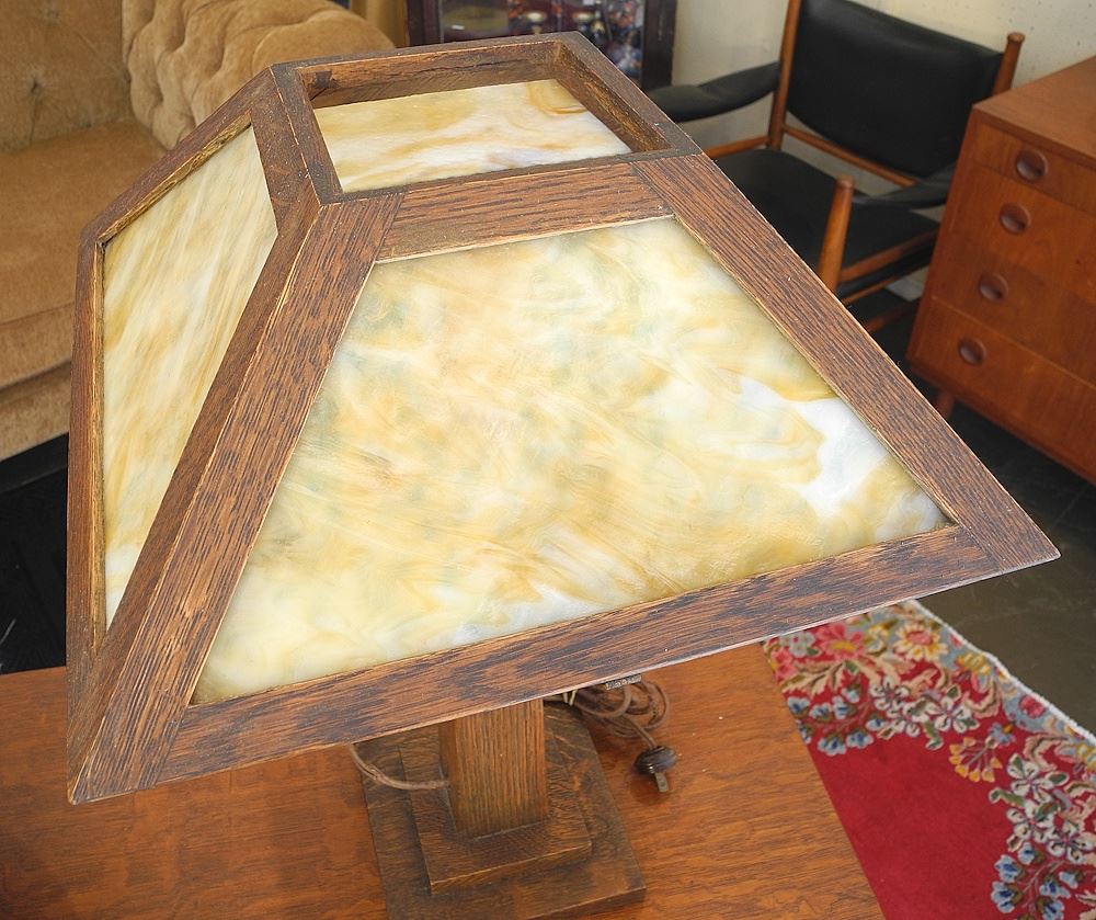 LOT 11 Arts & Crafts-Style Oak Table Lamp with Caramel Glass Shade, 22"h. Estimate: $150 - $250 Sold For: $325 Auction Date: Tuesday, July 15 2025 at 4:00 PM