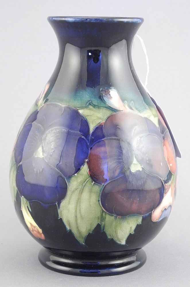 LOT 143 Moorcroft Pansy Vase, 6 1/8"h. Estimate: $60 - $100 Auction Date: Tuesday, July 15 2025 at 4:00 PM