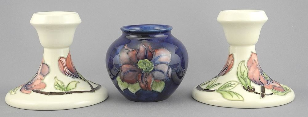 LOT 92 Three Pieces of Moorcroft: Pair of Candlesticks (3 3/8"h) with Boxes & Vase, 2 7/8"h. Estimate: $50 - $60 Sold For: $35 Auction Date: Tuesday, July 15 2025 at 4:00 PM
