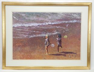 LOT 19 Unsigned Mixed Media on Panel, 18 x 25 3/4", "Children with Balloons at the Beach". Estimate: $50 - $150 Auction Date: Tuesday, July 15 2025 at 4:00 PM