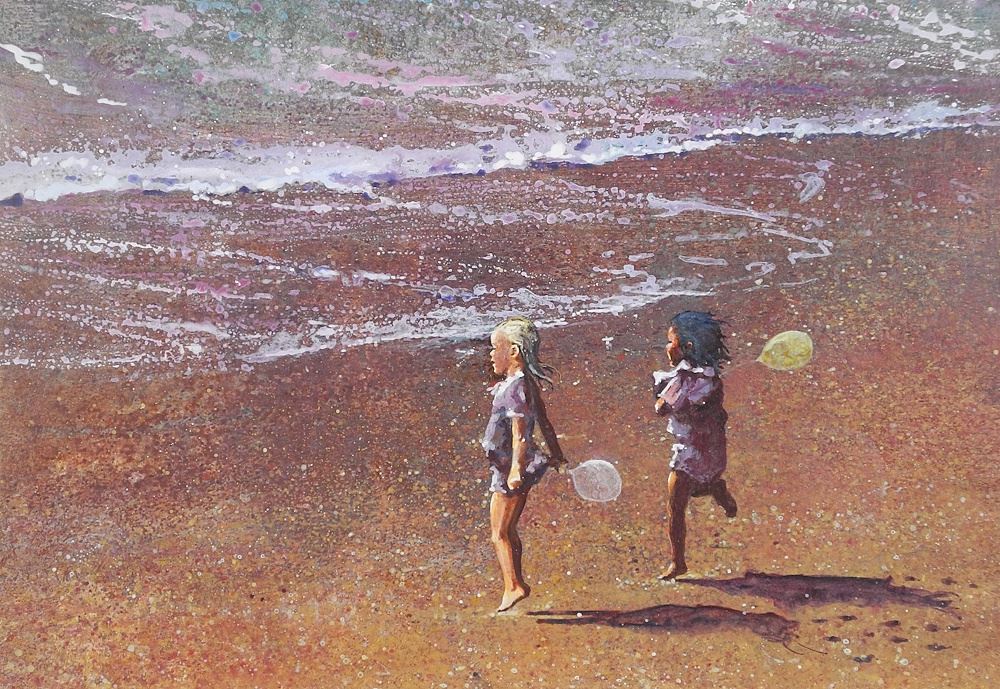 LOT 19 Unsigned Mixed Media on Panel, 18 x 25 3/4", "Children with Balloons at the Beach". Estimate: $50 - $150 Auction Date: Tuesday, July 15 2025 at 4:00 PM