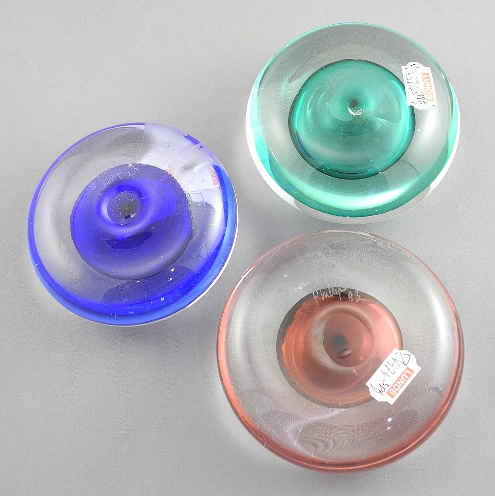 Three Glass Paper Weights signed Phillips'93, 3 1/4 - 3 5/8" Diam.