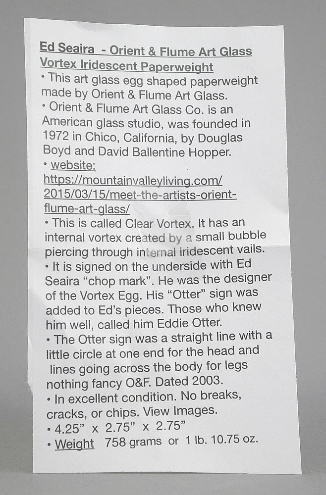 LOT 173 Orient & Flume Paperweight, Vortex Iridescent, Ed Seria Design, 4 1/8"h Estimate: $50 - $60 Sold For: $50 Auction Date: Tuesday, July 15 2025 at 4:00 PM