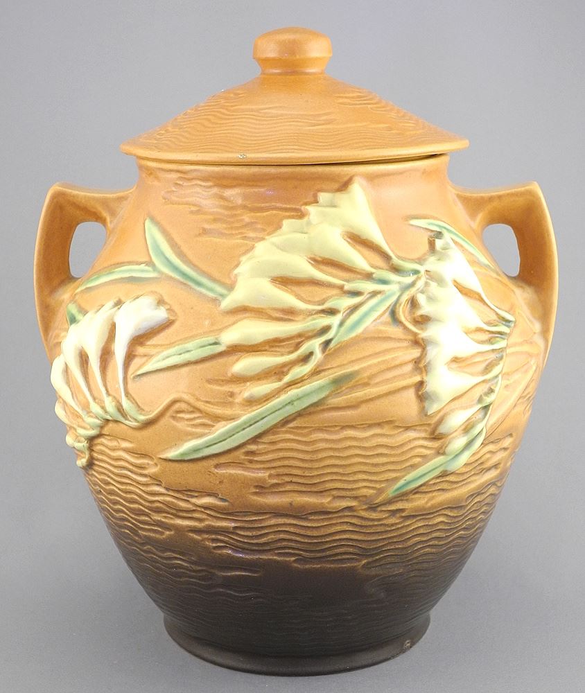 Roseville Freesia Covered Jar, 10 1/4"h (tiny flake lid inner rim).