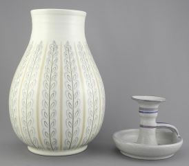 LOT 278 Poole Pottery Vase Marked EX/YHP (9 5/8") with Carter Stabler Adams Chamber Stick, 3 3/4"h. Estimate: $60 - $100 Sold For: $90 Auction Date: Tuesday, July 15 2025 at 4:00 PM