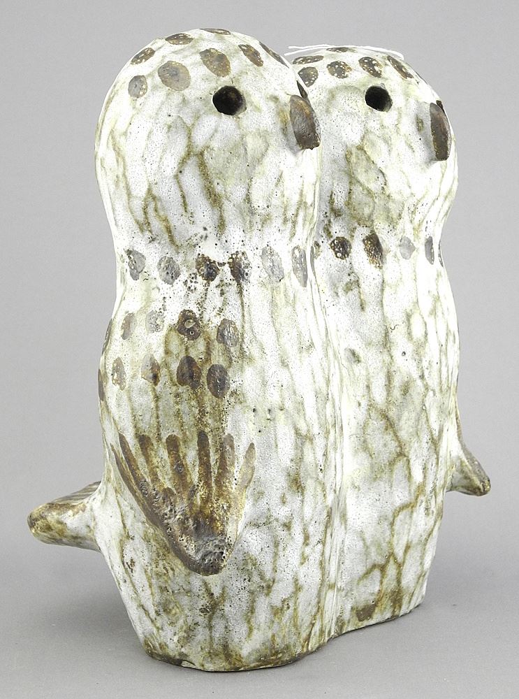 LOT 18 Stoneware Sculpture Monogrammed TK (Thomas Kakinuma), 8 3/8"h, "Two Owls". Estimate: $150 - $200 Sold For: $150 Auction Date: Tuesday, July 15 2025 at 4:00 PM