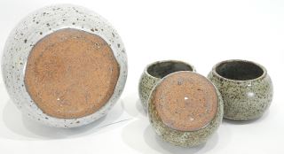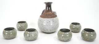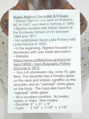 LOT 333 Stoneware Decanter & Six Cups signed (Robin) Righton'73, 7 7/8"h. Estimate: $50 - $70 Sold For: $35 Auction Date: Tuesday, July 15 2025 at 4:00 PM